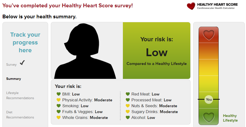 The results of the survey display your risk of cardiovascular disease from individual factors such as BMI, physical activity, smoking, eating and drinking habits, as well as your overall risk. You can also view personalized recommendations for improving or maintaining health habits.