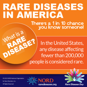 In the United States a rare disease is defined as affecting less than 200,000 people. Although individual diseases may be “rare”, being diagnosed with one is not. Nearly 30 million Americans are living with a rare disease, and two-thirds of those are children. Many types of cancer, PKU, Rett syndrome, Huntington’s disease, and are all on the list of the 7,000 known rare diseases. Rare diseases are often difficult to diagnose and treatments or cures are often scarce. Click here for 7 ways to participate in Rare Disease Day.